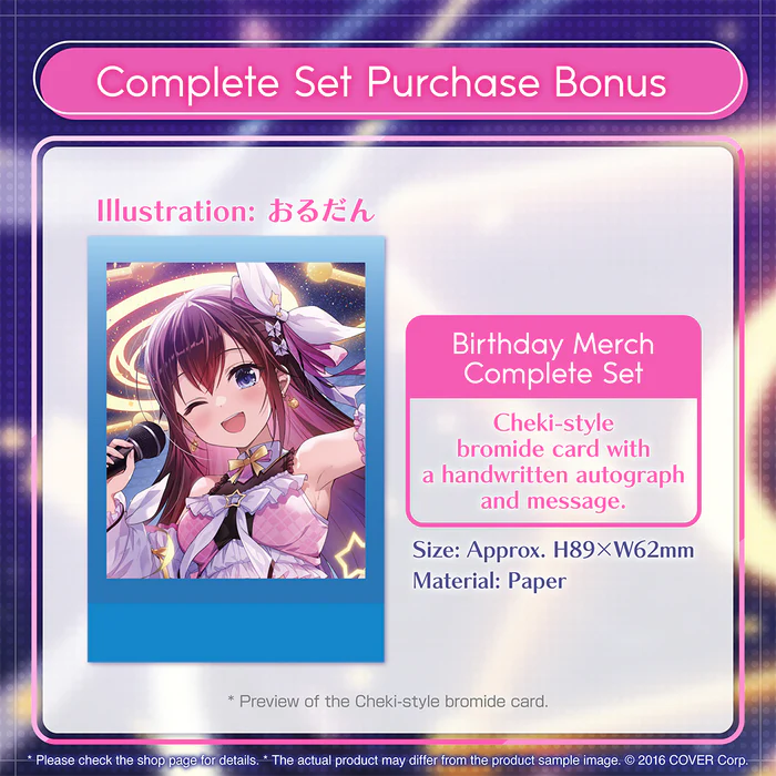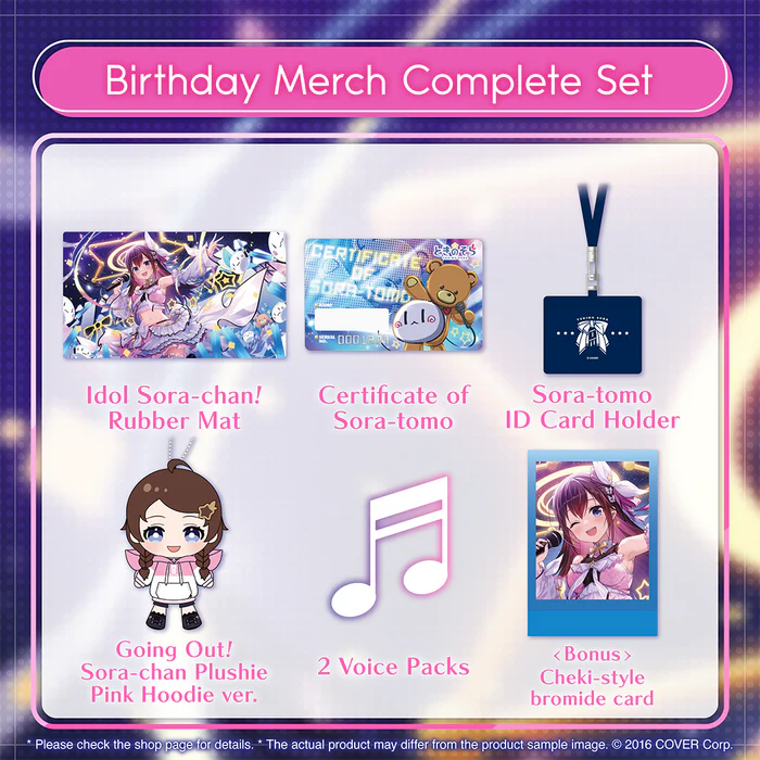 Celebrate Tokino Sora’s special day with the complete set of birthday merchandise. This set includes: