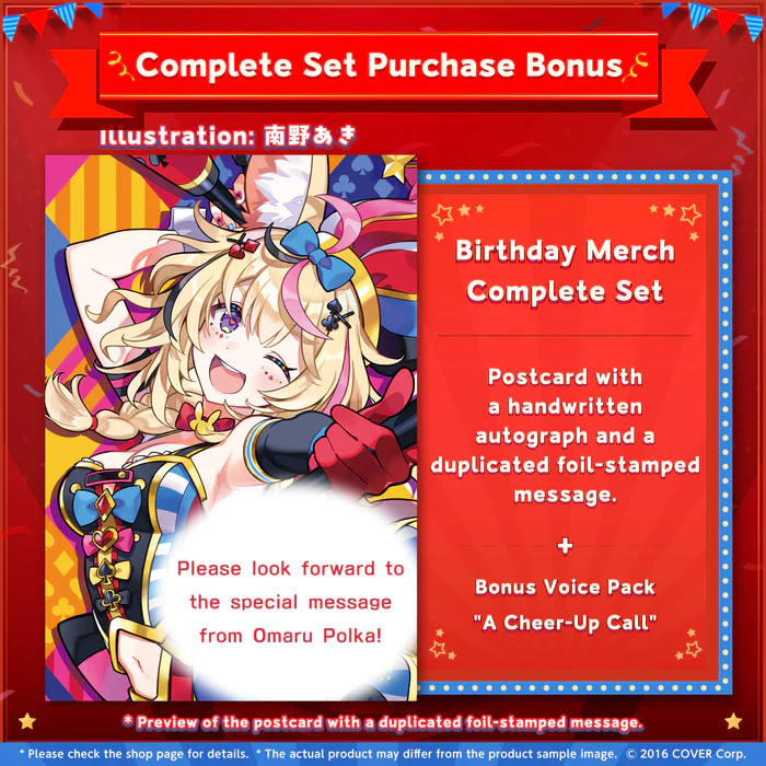 This set includes four unique merch items, a voice pack, and a special postcard featuring an autograph and message from Omaru Polka, illustrated by 南野あき. The voice pack, titled "A Cheer-Up Call," adds an extra personal touch, making it a must-have for fans.
