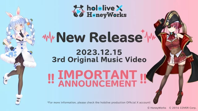 In an exciting collaboration, "HoneyWorks," known for creating numerous popular songs, and the female VTuber group "hololive," boasting an average YouTube channel subscriber count of over 1 million people, have joined forces! Stay tuned for the release of their third original song, sung by Usada Pekora and Houshou Marine, with the music video coming out on Friday, December 15th, and the digital song release at midnight on Saturday, December 16th.