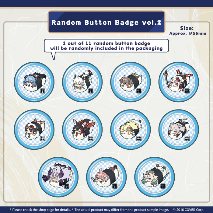 If you're into collecting unique items, our holoSushi Random Button Badges are the perfect addition to your collection. In each package, you'll receive a random badge from either Volume 1 or Volume 2. These badges, with a diameter of approximately 56mm, feature different designs inspired by the holoSushi series. Please note that the design you receive will be entirely random, adding an element of surprise to your collection. 🎉