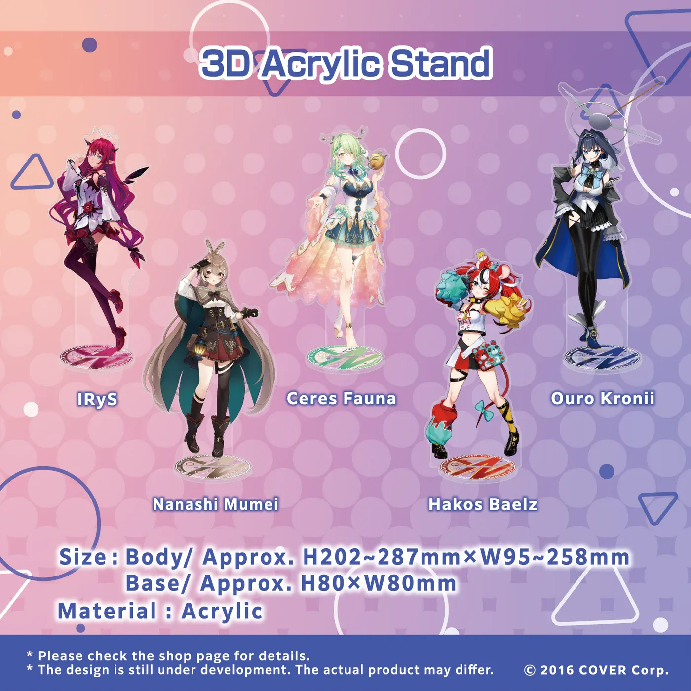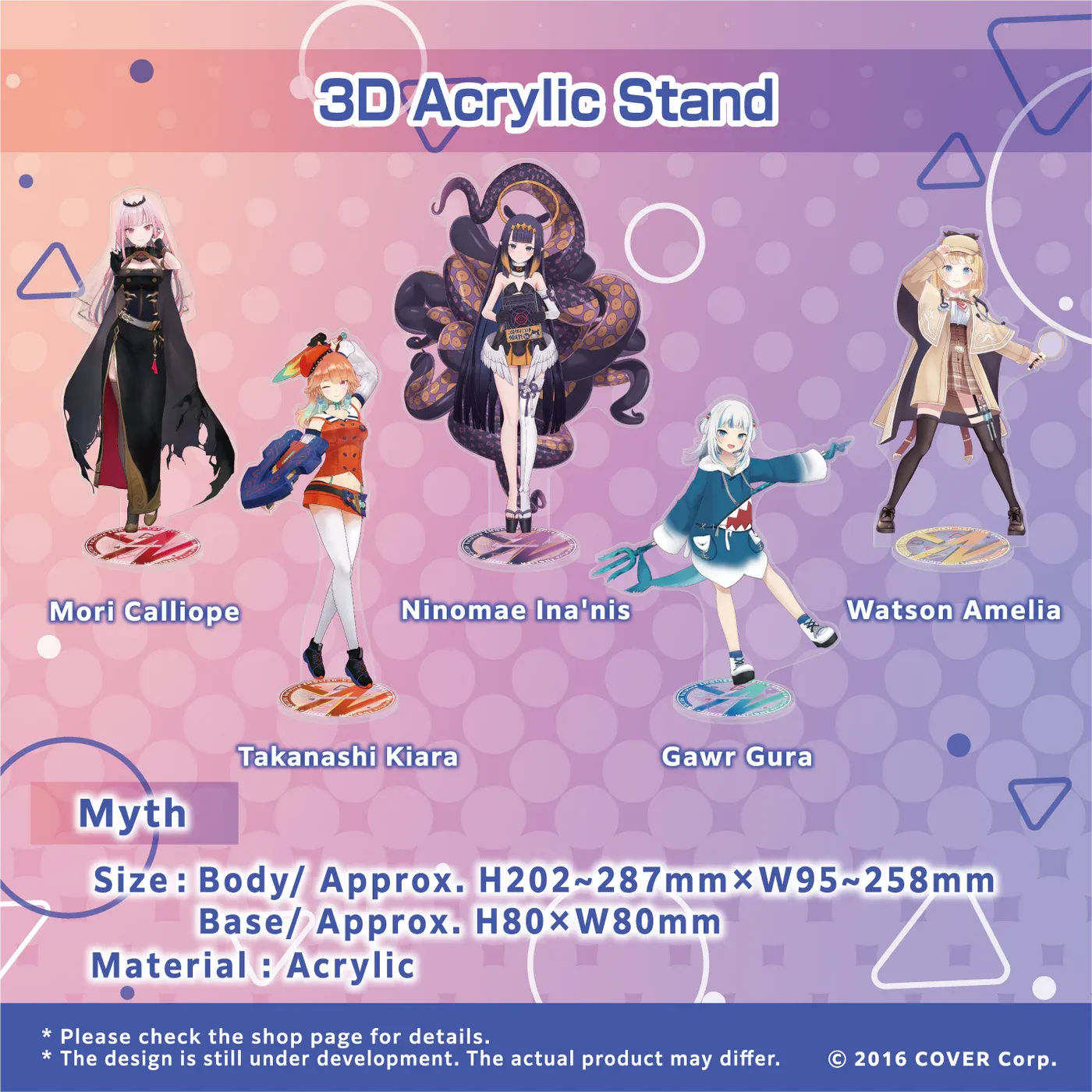 Introducing the must-have merchandise for all Hololive English enthusiasts - the mesmerizing 3D acrylic stands! These stands are not just collectibles; they're a testament to the charisma and charm of your favorite Hololive English talents, from the legendary Hololive Myth to the enchanting Hololive Promise. With intricate designs and impeccable detailing, these acrylic stands are a true celebration of virtual talent. But remember, their availability is limited, and once they're gone, they're gone. Don't miss out on the chance to adorn your space with these delightful pieces of art. Secure your pre-order today and look forward to their arrival, shipping from Japan in late October 2023. 🚀✨