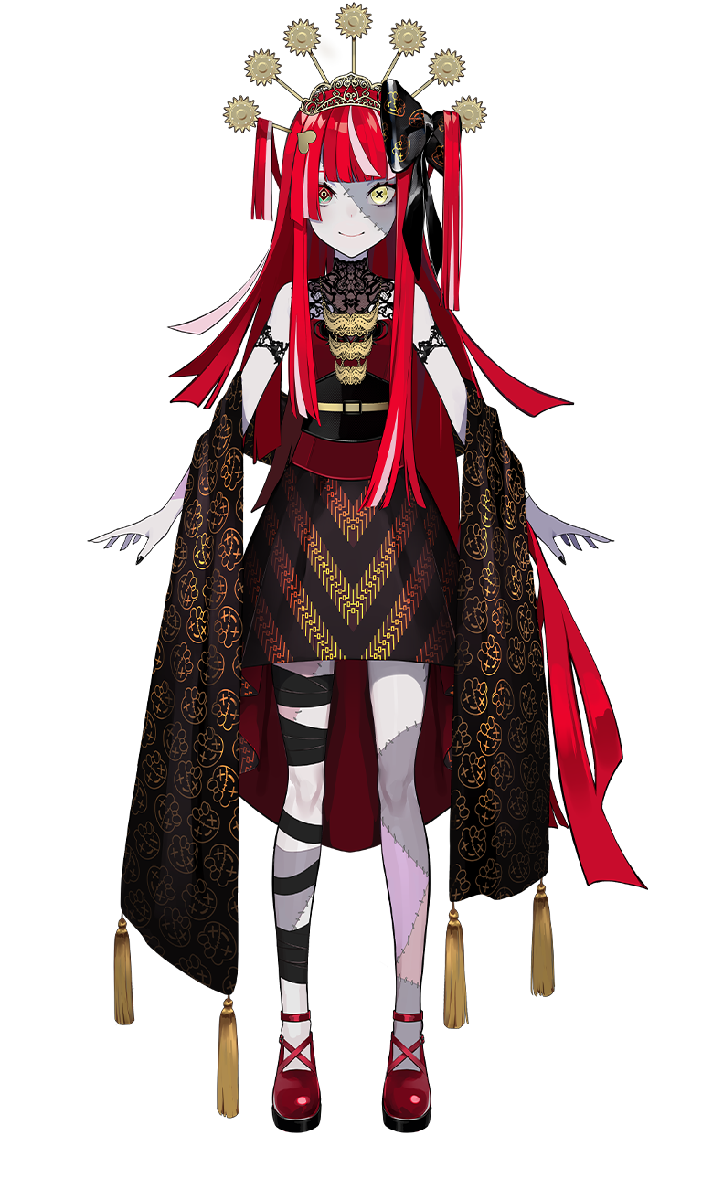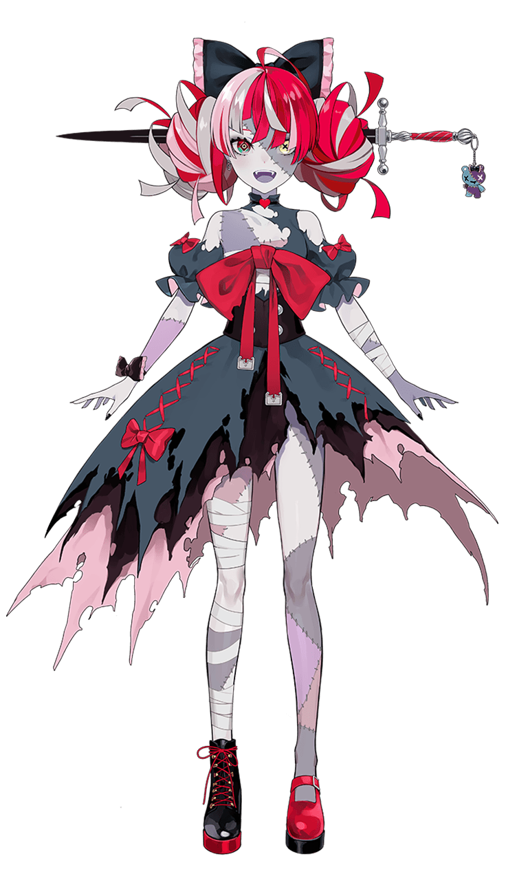 Ollie's appearance is as distinctive as her personality. She resembles a patchwork golem, with skin alternating between light gray and sections stitched with various shades of gray, pink, and purple. Her bun-style hair is a striking gray and red, and her eyes are equally captivating. One eye is red with a diamond-shaped pupil, while the other appears to be a yellow button with an "X" as the pupil. She wears a charming, mismatched outfit with a large black bow on her head. 🧟♀️