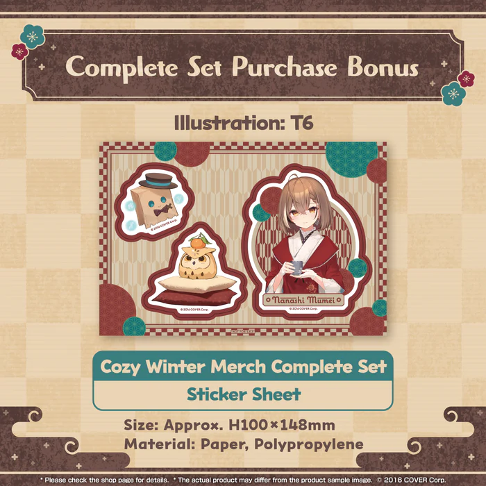 The centerpiece of this collection is the "Cozy Winter Merch Complete Set". This bundle encapsulates the essence of a snug winter, featuring three beautifully designed merch items and a bonus sticker sheet illustrated by T6. Please note, the package will include one of four randomly selected rubber straps, adding an element of surprise to your purchase.