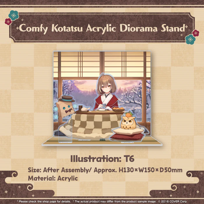 The Comfy Kotatsu Acrylic Diorama Stand, illustrated by T6, is a standout item. Once assembled, this charming diorama creates a mini winter scene featuring Mumei, measuring approximately H130×W150×D50mm. Made of high-quality acrylic, it's a delightful piece that brings the cozy warmth of a traditional kotatsu right to your desk or shelf.