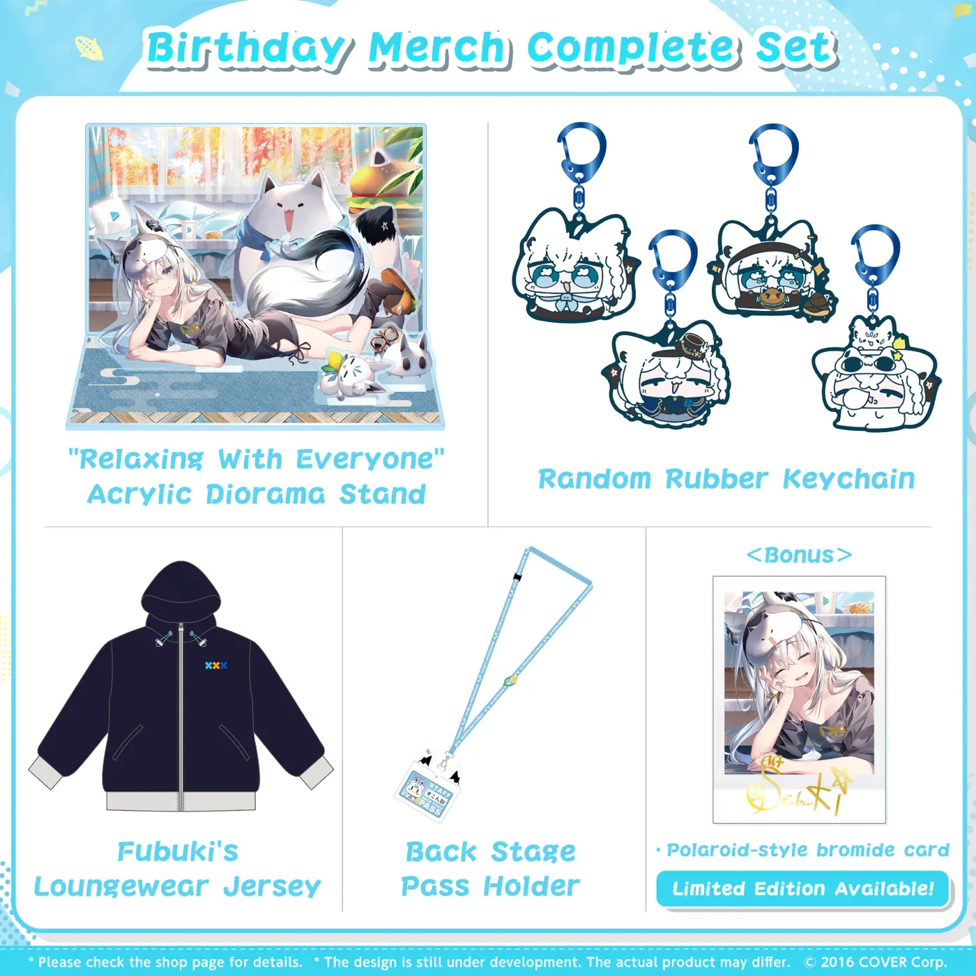 Don't miss out on the exclusive Shirakami Fubuki Birthday Celebration 2023 merchandise! As we celebrate the incredible journey of hololive's beloved idol, you have the opportunity to own a piece of this special occasion. The Birthday Merch Complete Set includes four unique birthday items and a bonus polaroid-style bromide card with a duplicated foil-stamped autograph from Shirakami Fubuki herself. Please note that you'll receive one random rubber keychain out of four possible designs. This set is a wonderful way to commemorate her birthday and show your support. Get yours before they're gone!