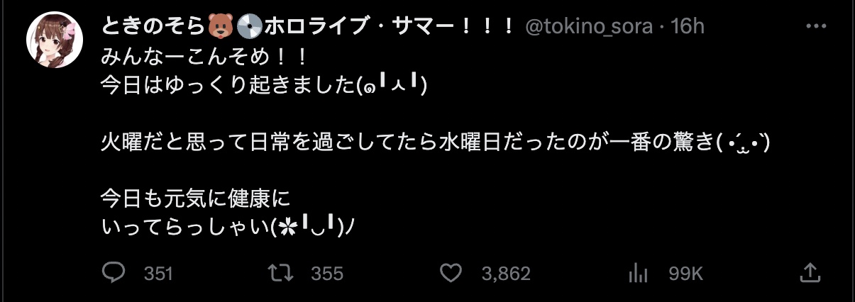 Image: Tweets from Tokino Sora. Source: Tokino Sora Official X account. (https://twitter.com/tokino_sora)