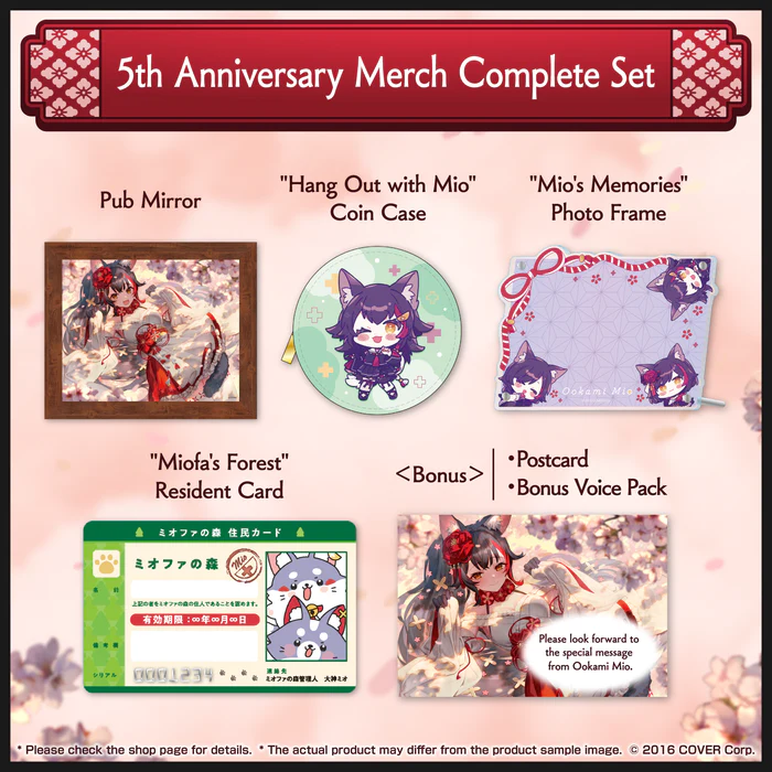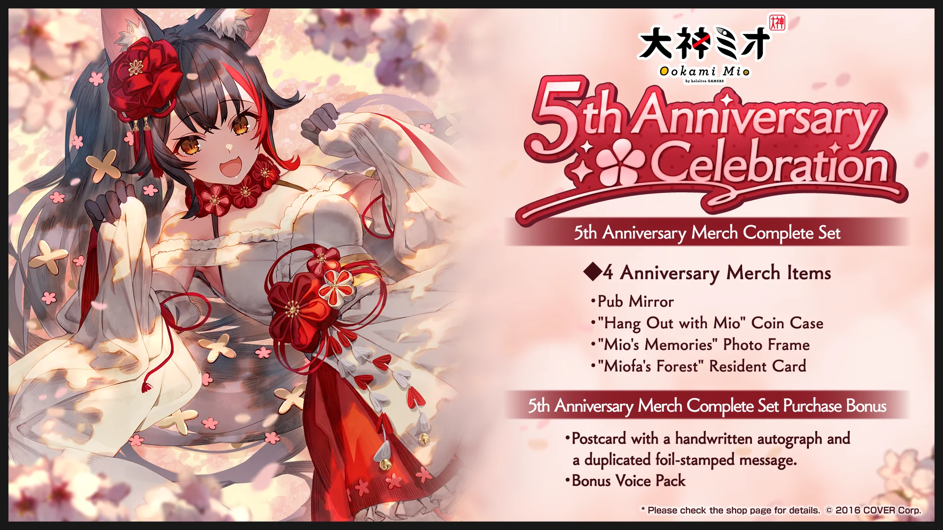 This complete set includes four anniversary merch items, a bonus postcard with a handwritten autograph, and a duplicated foil-stamped message from Ookami Mio herself. Plus, you'll receive an exclusive voice pack titled "Together With You Even After My 5th Anniversary!" 💌📢
