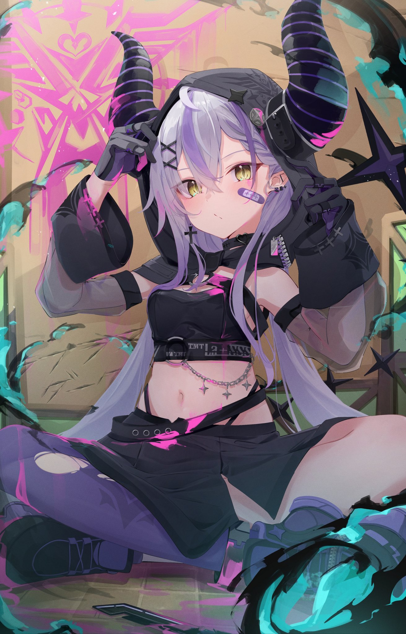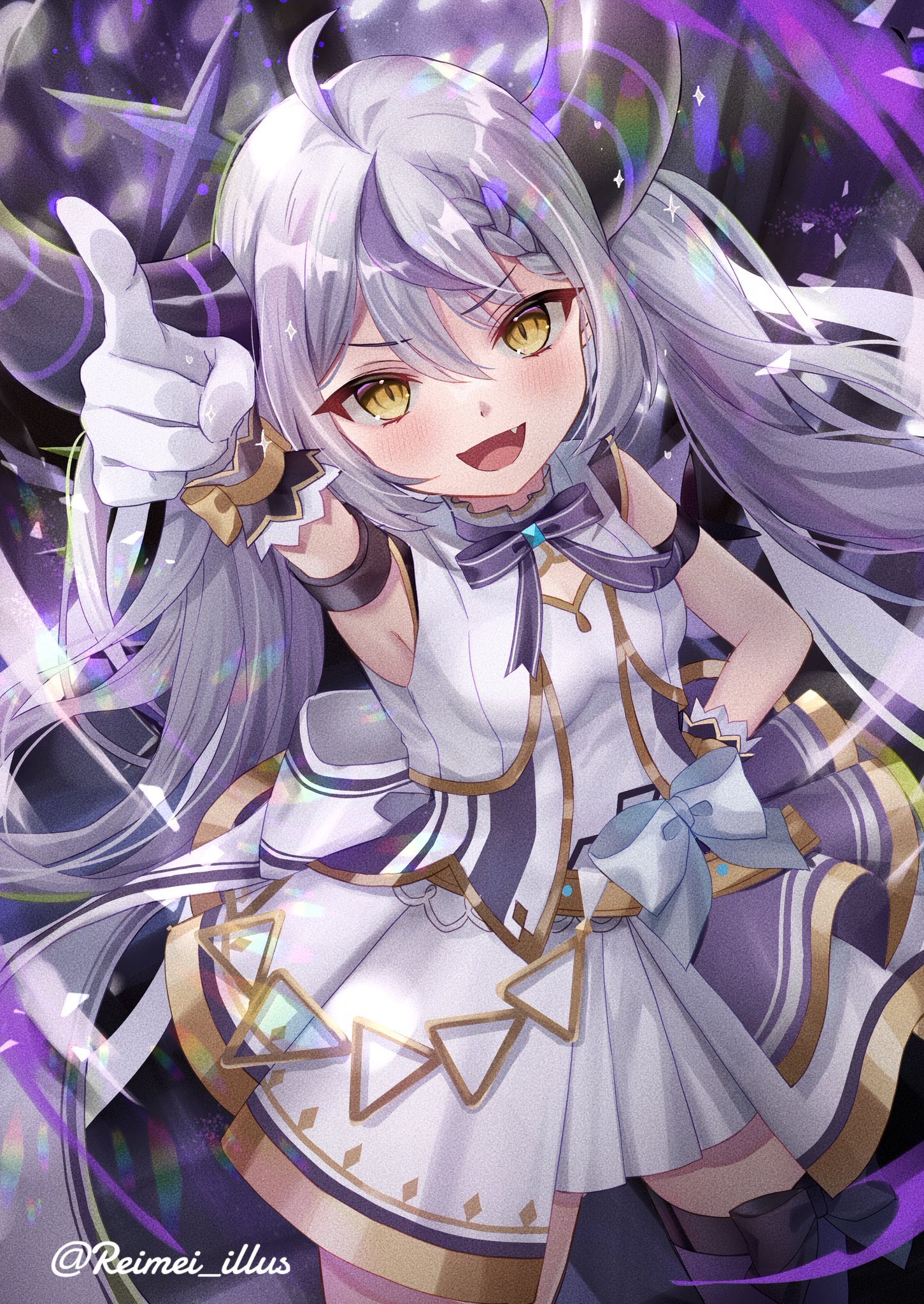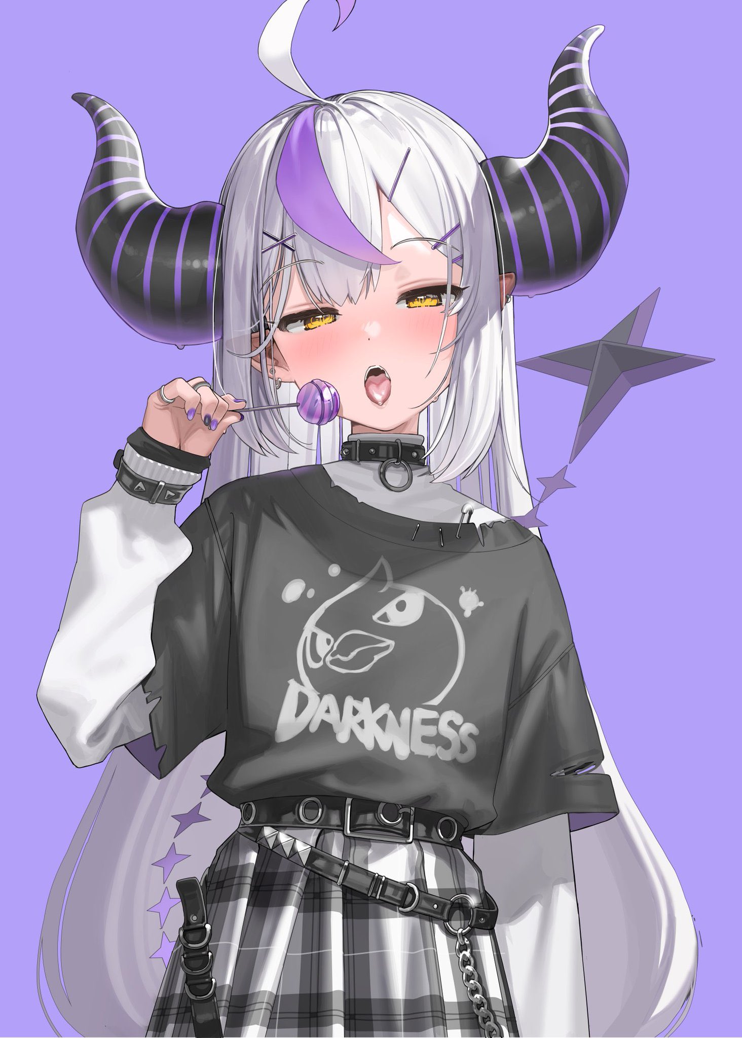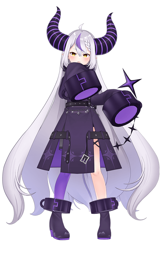 Laplus boasts a unique and captivating appearance. Her long, silvery hair features a distinctive purple lock and braided bang. Two imposing dark purple horns adorned with lighter purple stripes extend from her head, adding to her mystique. Her piercing yellow eyes are a captivating sight for her fans.