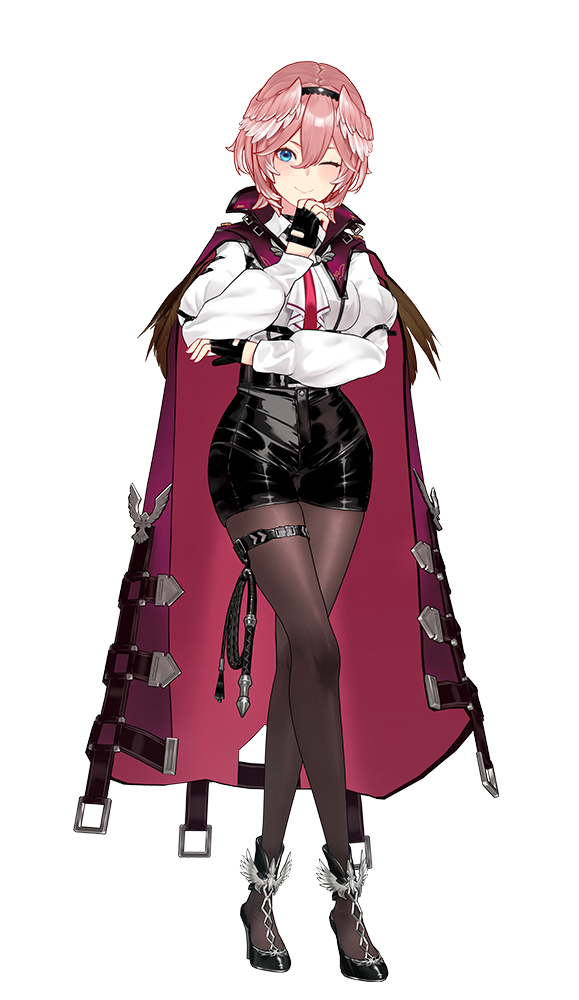 Lui's striking appearance is instantly recognizable. With her short pink hair adorned with wings, she sports a dark magenta cape over a white top and black high-waisted shorts. Her captivating blue eyes add an element of mystery to her overall look. If you're into fashion, you'll appreciate her distinct sense of style.