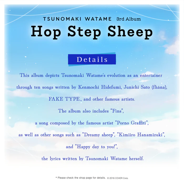 The album doesn't stop there; it also boasts "Fins," a captivating song composed by the famous artist "Porno Graffiti." And that's not all – other tracks such as "Dreamy sheep," "Kimiiro Hanamizuki," and "Happy day to you!" feature lyrics written by none other than Tsunomaki Watame herself. These collaborations promise to deliver a musical journey that's truly one of a kind. 🎤🌈
