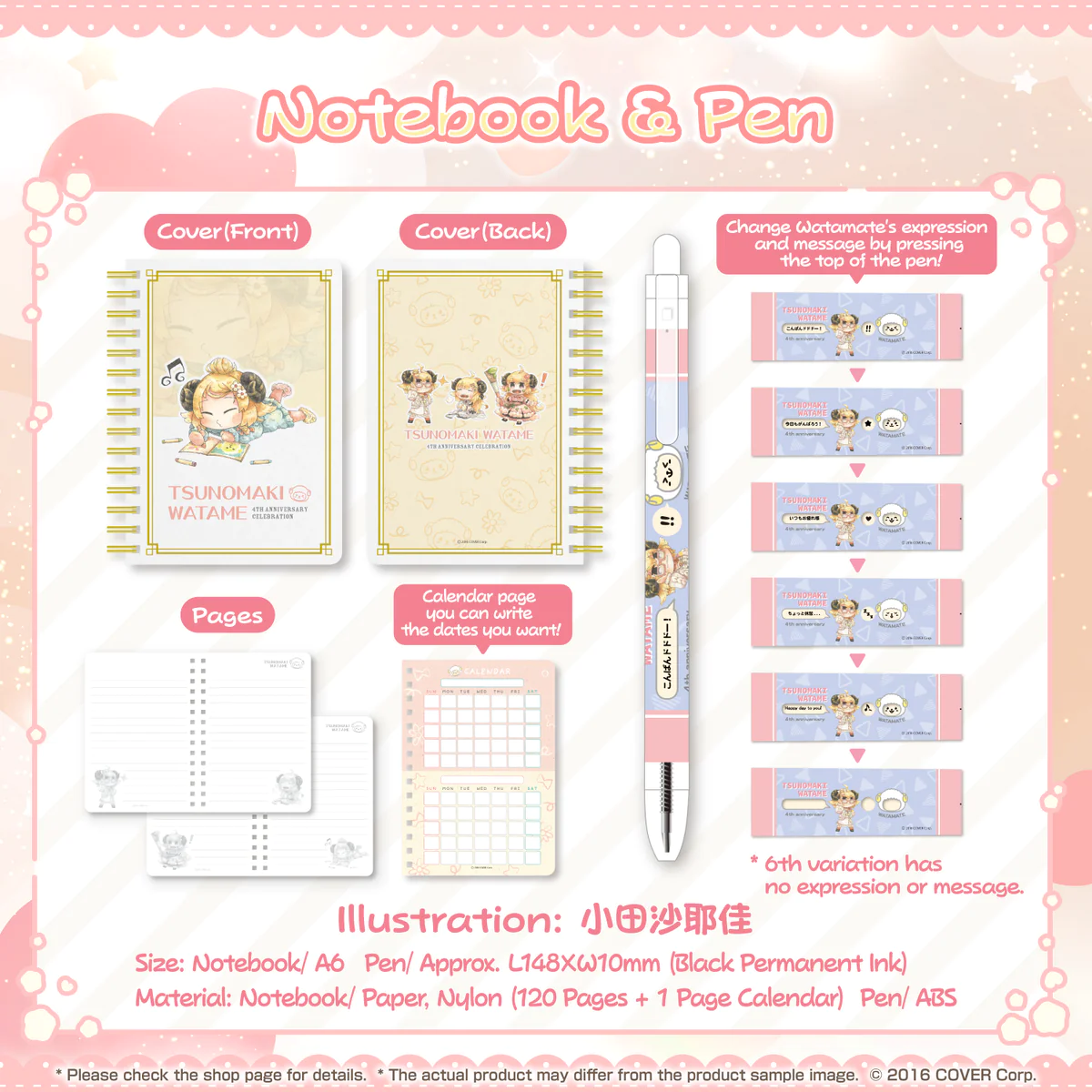 Keep your notes and thoughts in a special A6-sized notebook adorned with illustrations by 小田沙耶佳. The set also includes a sleek black permanent ink pen measuring approximately L148×W10mm. Get ready to jot down your dreams and ideas!
